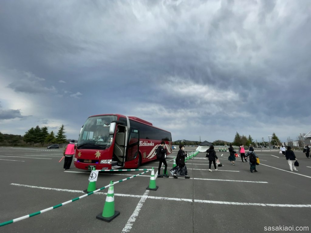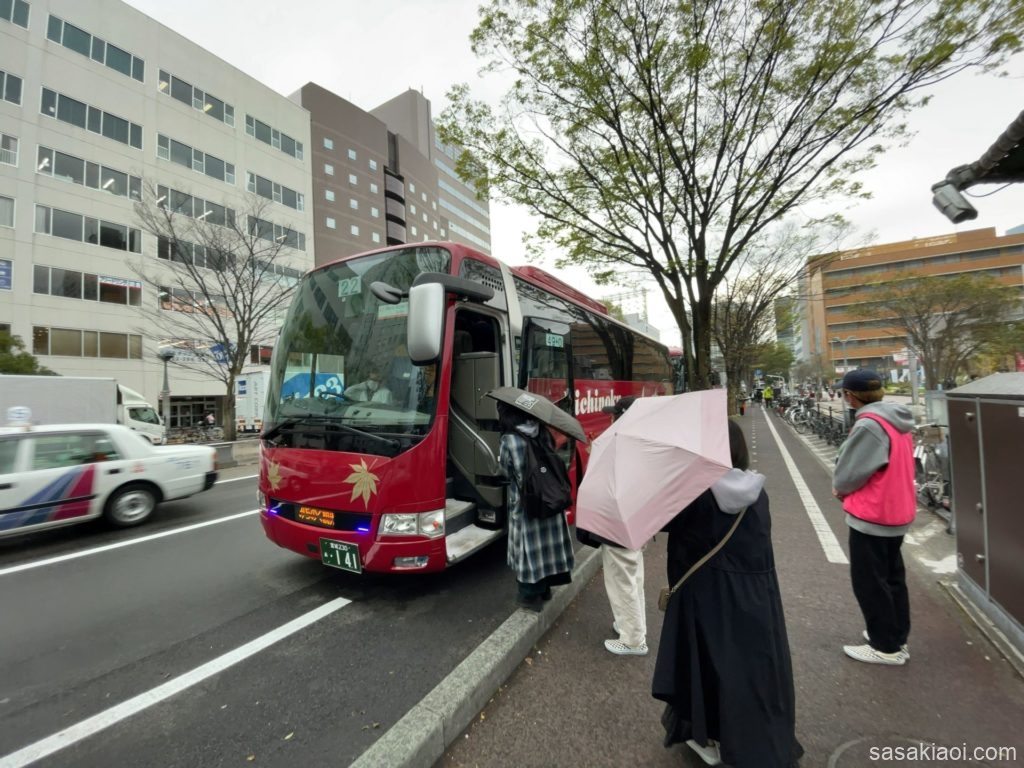 行きのシャトルバスは、着席後おおむね10分ほどで車内は満席になり仙台駅を発車しました。この様子だと、乗り場で30分も1時間も待たされる、ということはなさそうな雰囲気でした。
