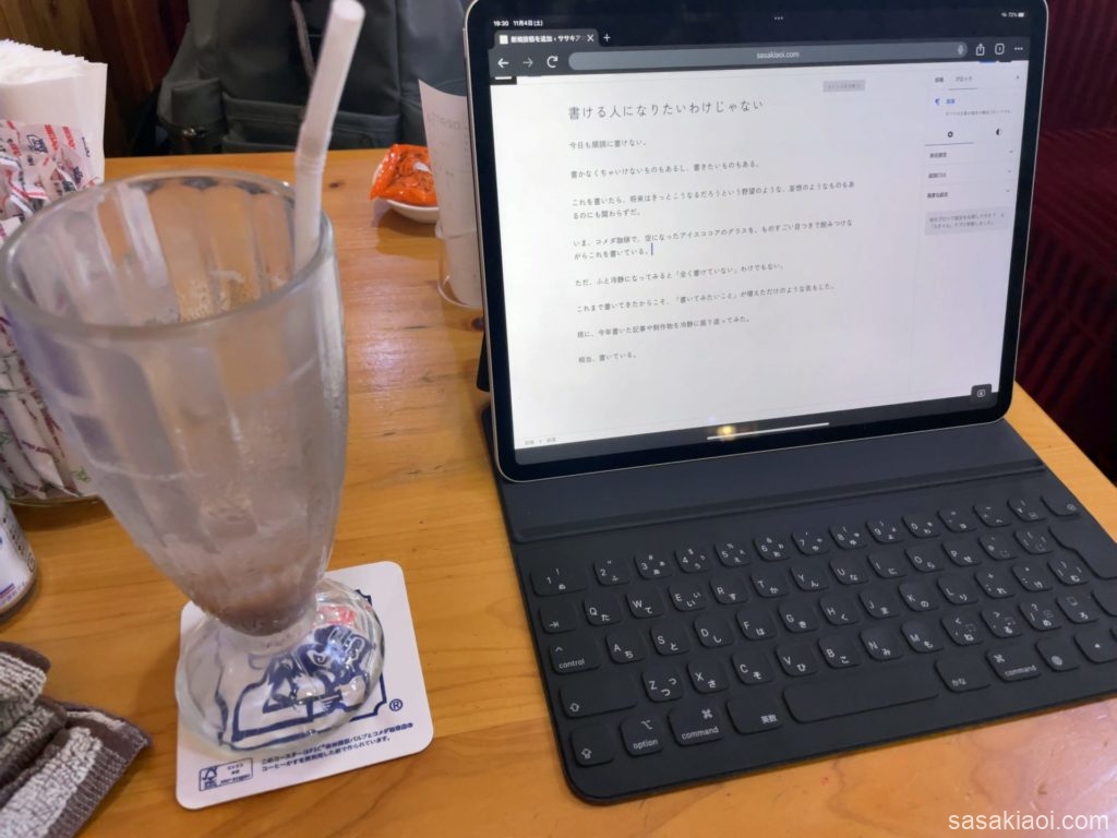 いま、コメダ珈琲で、空になったアイスココアのグラスを、ものすごい目つきで睨みつけながらこれを書いている。