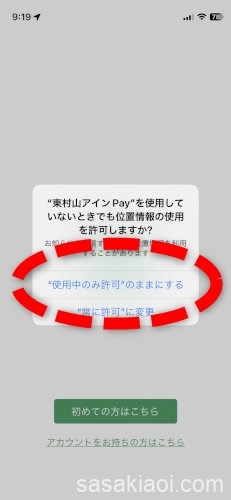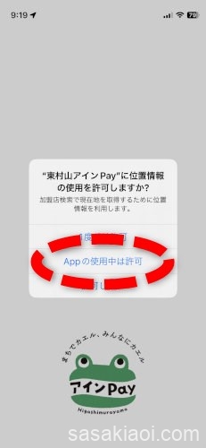 つづけて、アインペイアプリを使用していないときに位置情報を利用していいかの確認画面が出ます。