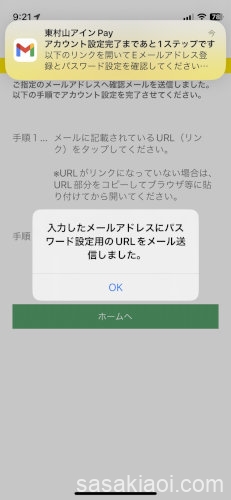 すぐにメールも届くので、一旦アインペイアプリから離れて、メールアプリを開きましょう。