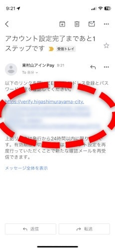 リンクをタップすると、ふたたび東村山アインPayアプリの画面に戻ります。