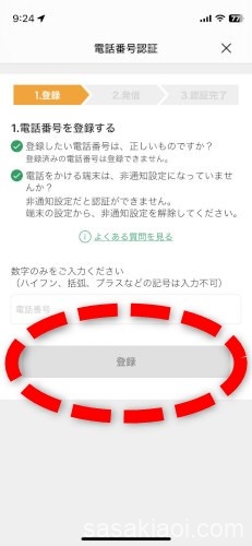 注意点を確認して、電話番号を入力して「登録」をタップします。