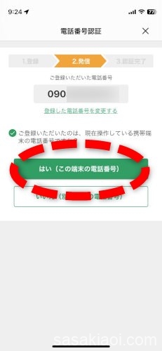 (操作しているスマホ以外の電話番号を登録する場合は「いいえ」をタップします。)