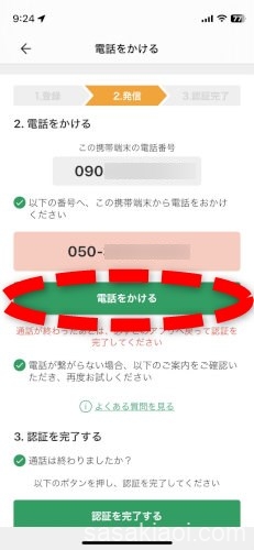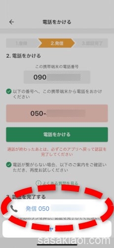 登録した電話番号が再度表示され、赤枠で囲われた番号に電話を掛けます。