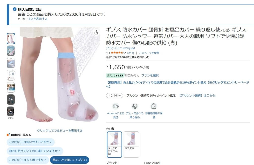 入浴時に、患部をカバーできるアイテムと、風呂場のすべり止めをamazonで購入。