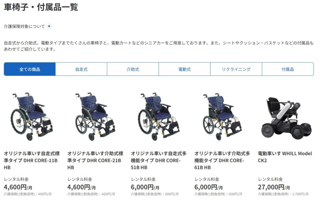 ダスキンヘルスレントさんの車いすを検討。介護保険が適用されない場合は1カ月で5,000円程度から利用できる模様。