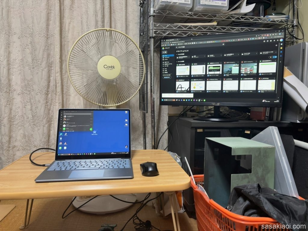 ノートPC環境で、実家からでもスケジュール調整や軽い作業なら対応可能な構成とした。